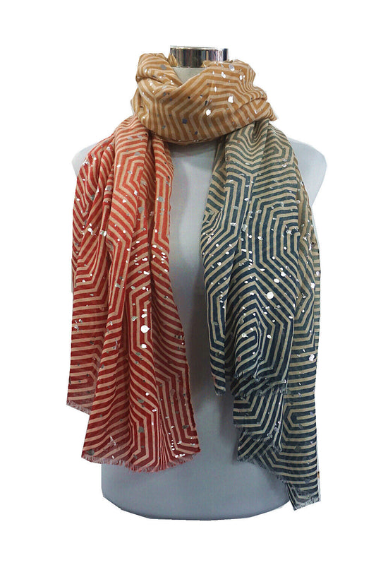 Multi colour Foiled Silver Dots Geometric Lines Pattern Scarf